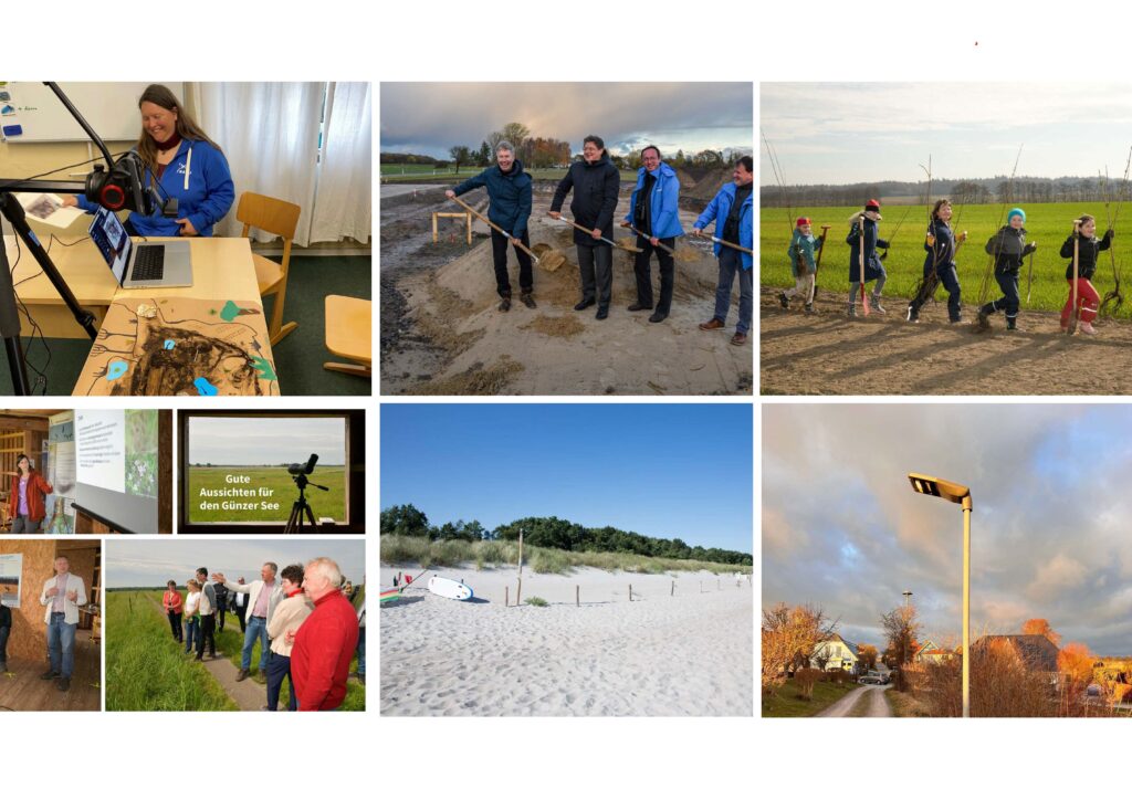 „Im neuen Projekt Vernetzte Vielfalt an der Schatzküste geht es nun stärker darum, gemeinsam mit den Partnergemeinden Biotopnetze zu entwickeln und vielfältige, artenreiche Kulturlandschaften zu bewahren, in denen die Menschen gut leben und arbeiten können“, beschreibt die Projektleiterin das Ziel. „Die aufwändigen Vorbereitungsjahre liegen hinter uns, jetzt geht es immer mehr an die Umsetzung der Vorhaben. In den nächsten zwei Jahren werden wir viele Hecken anlegen, den Günzer See renaturieren, weitere Sölle und Kleingewässer wieder herstellen. Aber es gibt auch schon viele Ergebnisse: Das neue Kranichzentrum hat Richtfest gefeiert. Das Projekt Geisternetze von WWF Deutschland wird im Frühjahr 2025 bereits abgeschlossen. In Ahrenshoop leuchten die ersten 15 insektenfreundlichen Rotlicht-Lampen und der neue Trickfilm einer Grundschulklasse ist fertig. Bei den Citizen Science-Projekten wurden wieder viele Exemplare seltener Wildbienenarten entdeckt. Also wir sind diesmal sehr viel in der Fläche aktiv, um unsere Kulturlandschaft etwas zu verbessern, um etwas mehr Grün in die Landschaft zu bringen.“
