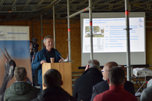 Der Bauherr Dr. Günter Nowald vom Kranichschutz Deutschland begrüßte am 18.10.2024 die Anwesenden zum Richtfest des Neubaus. Ganz in der Nähe zum KRANORAMA, der Aussichtsplattform