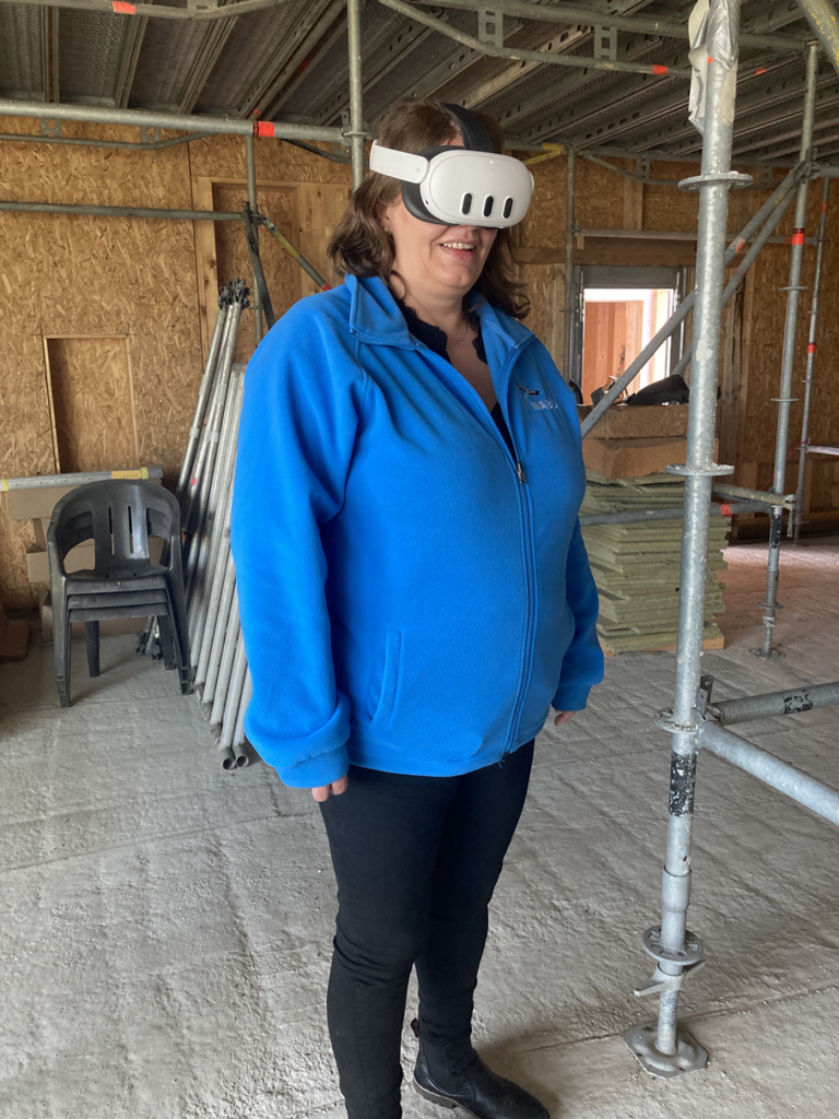 Dank VR-Brille konnte Susanne Baumann, NABU-Bundesgeschäftsführerin, nicht auf der Baustelle, sondern in den Themenbereich Moor eintauchen – eine von drei virtuellen Welten, die im neuen Kranichzentrum gezeigt werden.